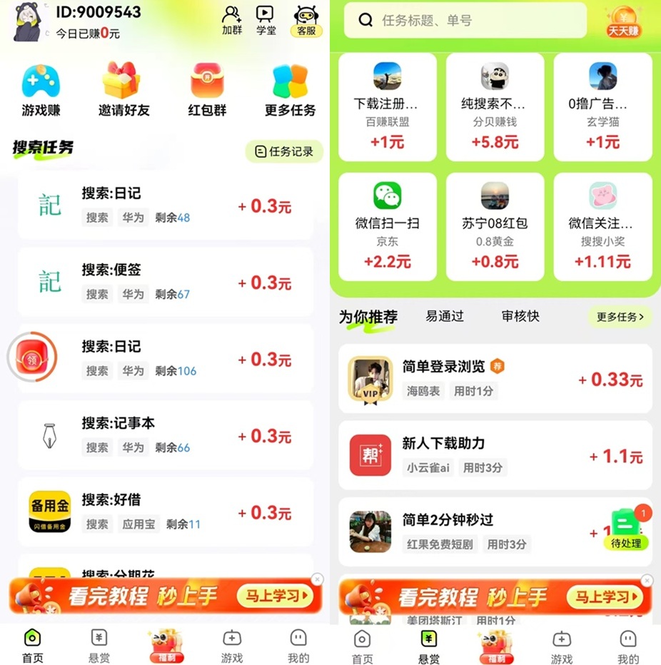 正文 有玩:新出搜索、悬赏、游戏试玩赚钱平台,双重奖励,流程简单 xd3042 V评论者 /今天/112阅读/0评论 0310 纯0撸广告赚+搜索赚+悬赏赚平台,零撸保底收益高悬赏助力放单红豹群看广告0.1-0.5米搜索赚高单价0.3米/个游戏试玩0.45米/个分成较高15%,好友合规渠道资金结算有奖励,好友合规渠道资金结算人数达标较高奖41888扫码下载收藏 | 0点赞 | 0打赏